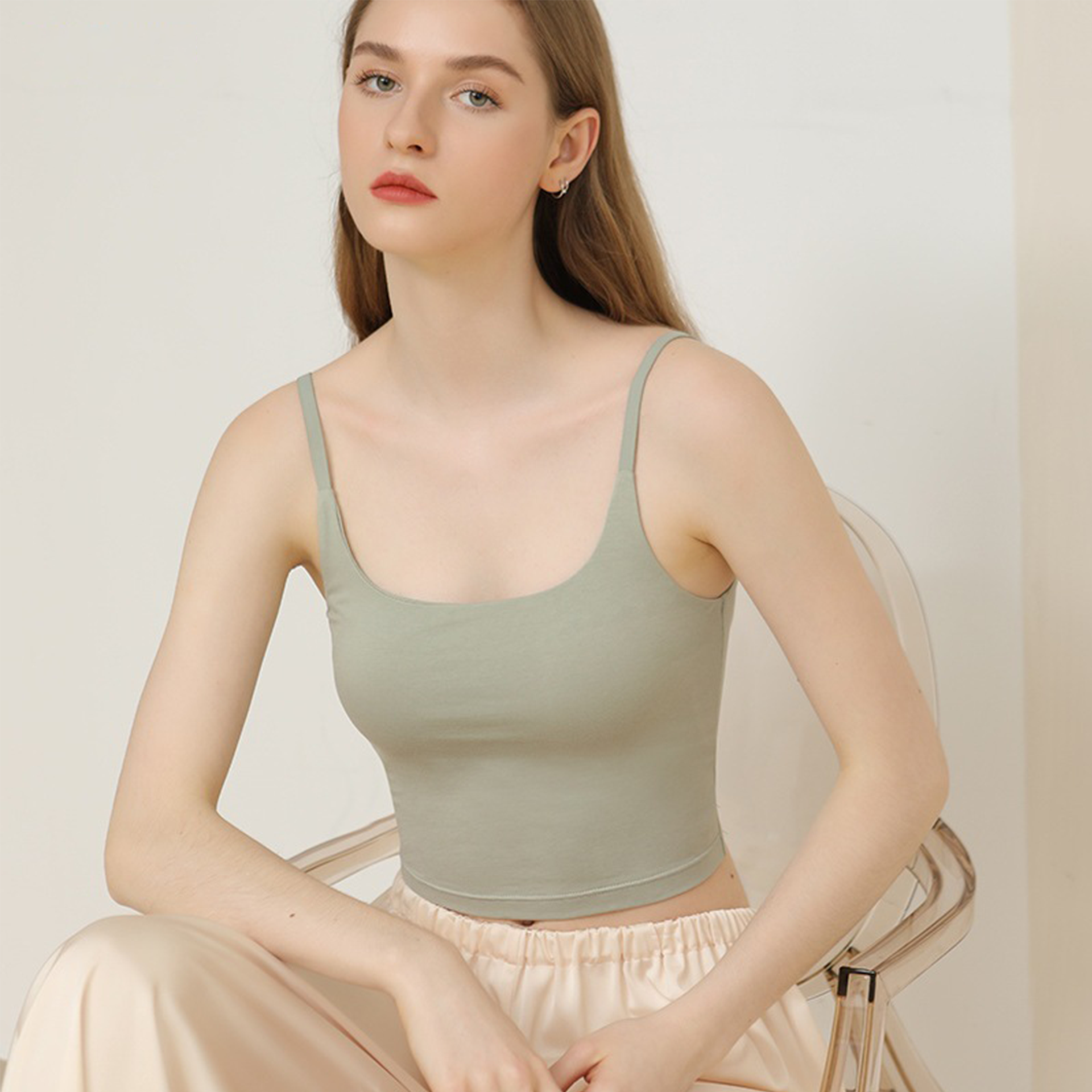 Cropped U-Neck Stretch Spaghetti Camisole With Bra Pad