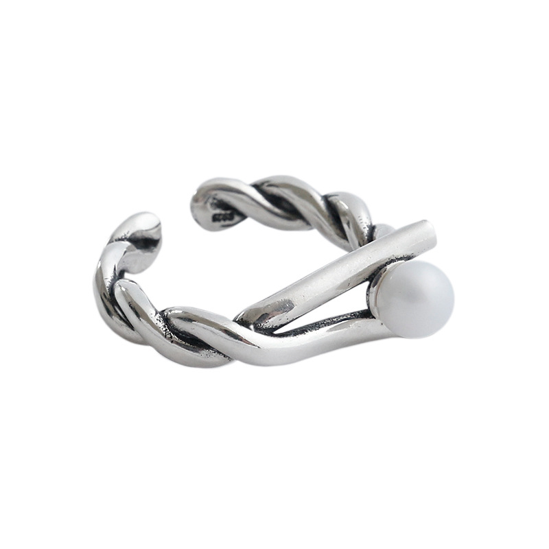 Retro Distressed INS Simple Retro Twist Twisted Shell Beads Open Silver Pearls Ring