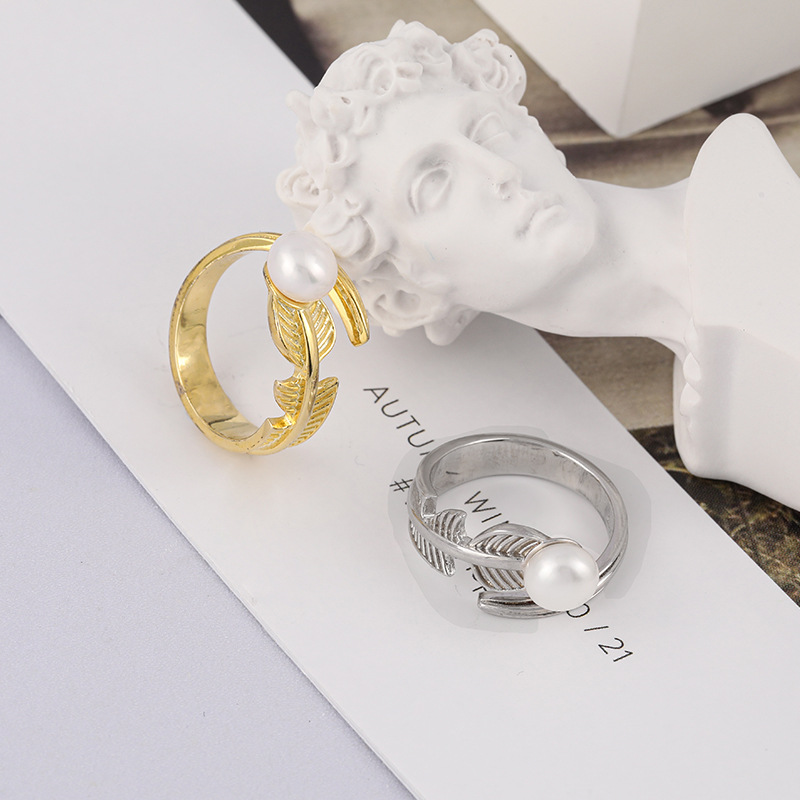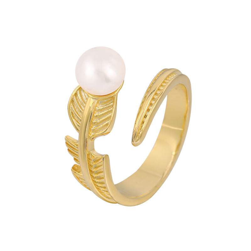 Women Fashion Feather Open Silver Freshwater Pearl Ring