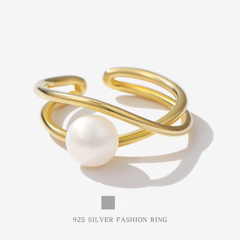 Female INS Simple Line Cross Geometric Opening Silver Pearl Ring
