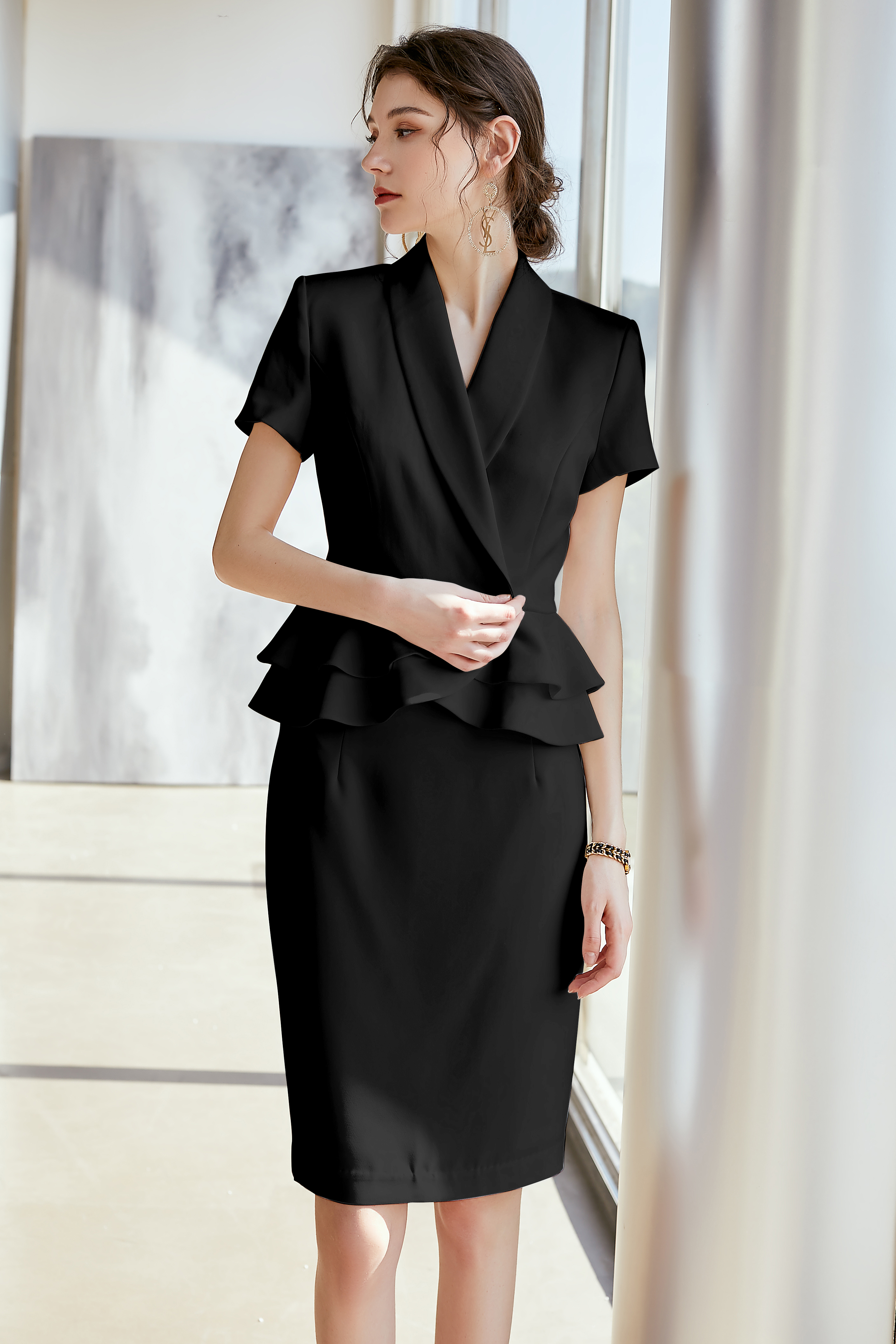 Black Shawl Collar Ruffle Belt Short Sleeve Two Piece Suit