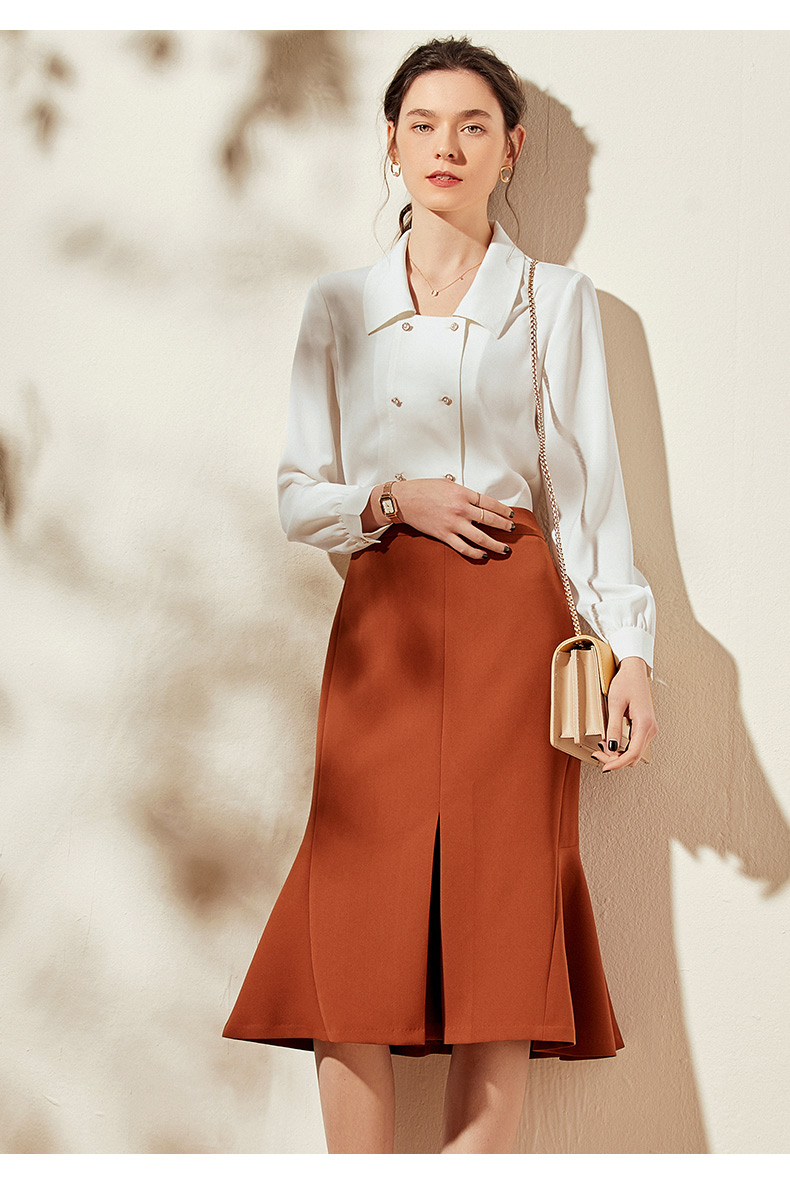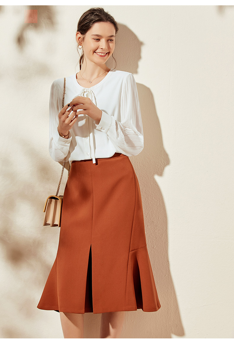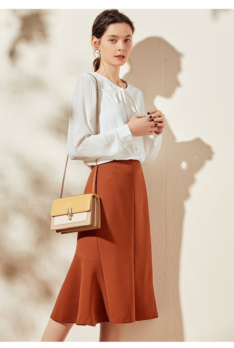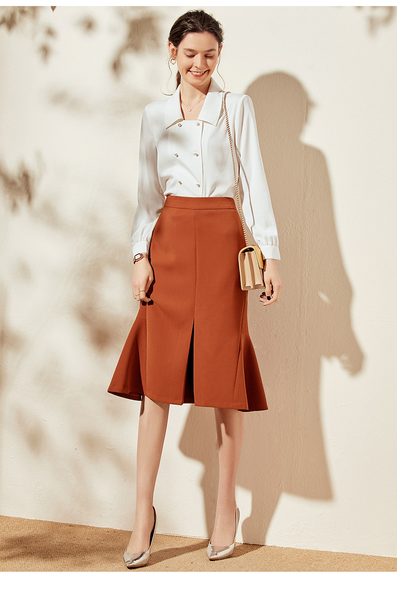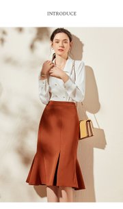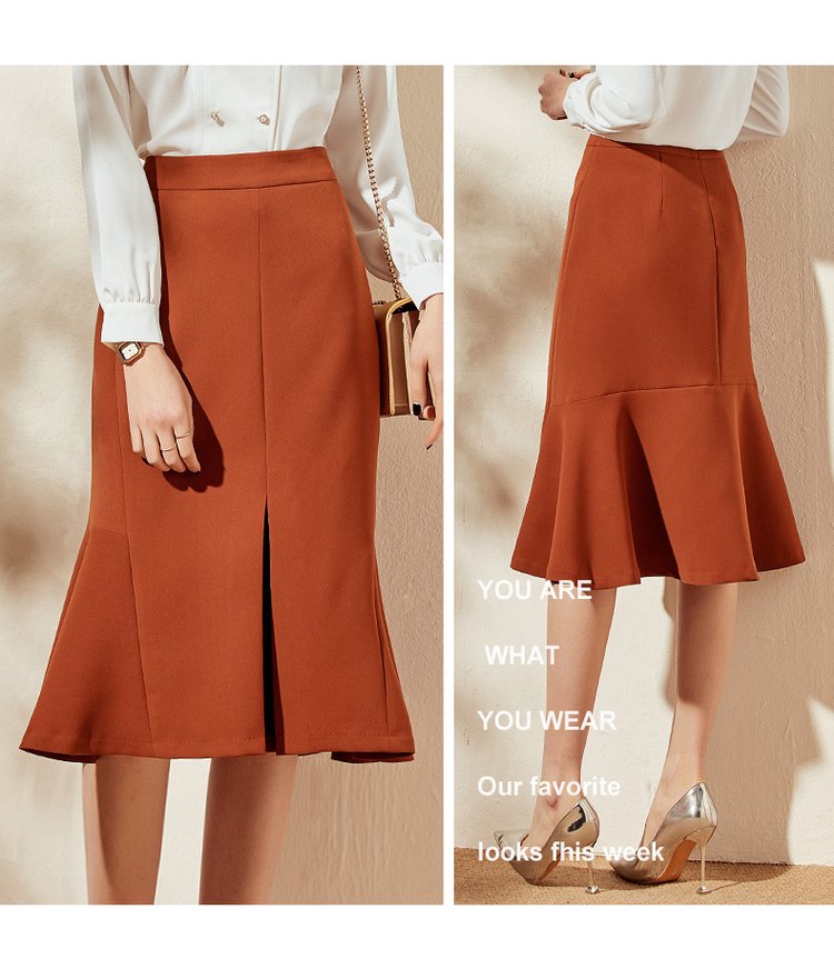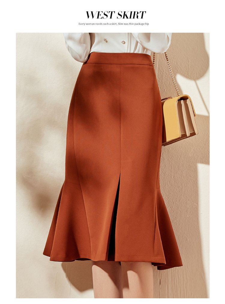 Pattern: plain Style: commuting OL styleWaist type: high waist Color classification: caramel color Skirt type: high waist skirt Skirt length: mid-length skirt Popular elements/craft: zipper Profile: Type A Material composition: polyester fiber 100%