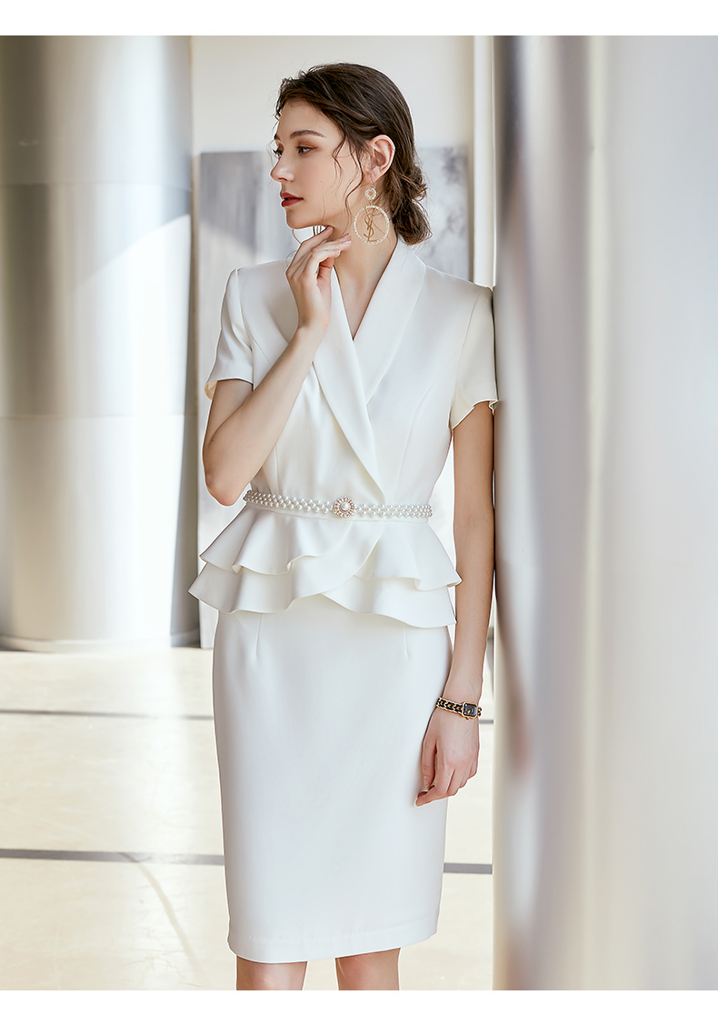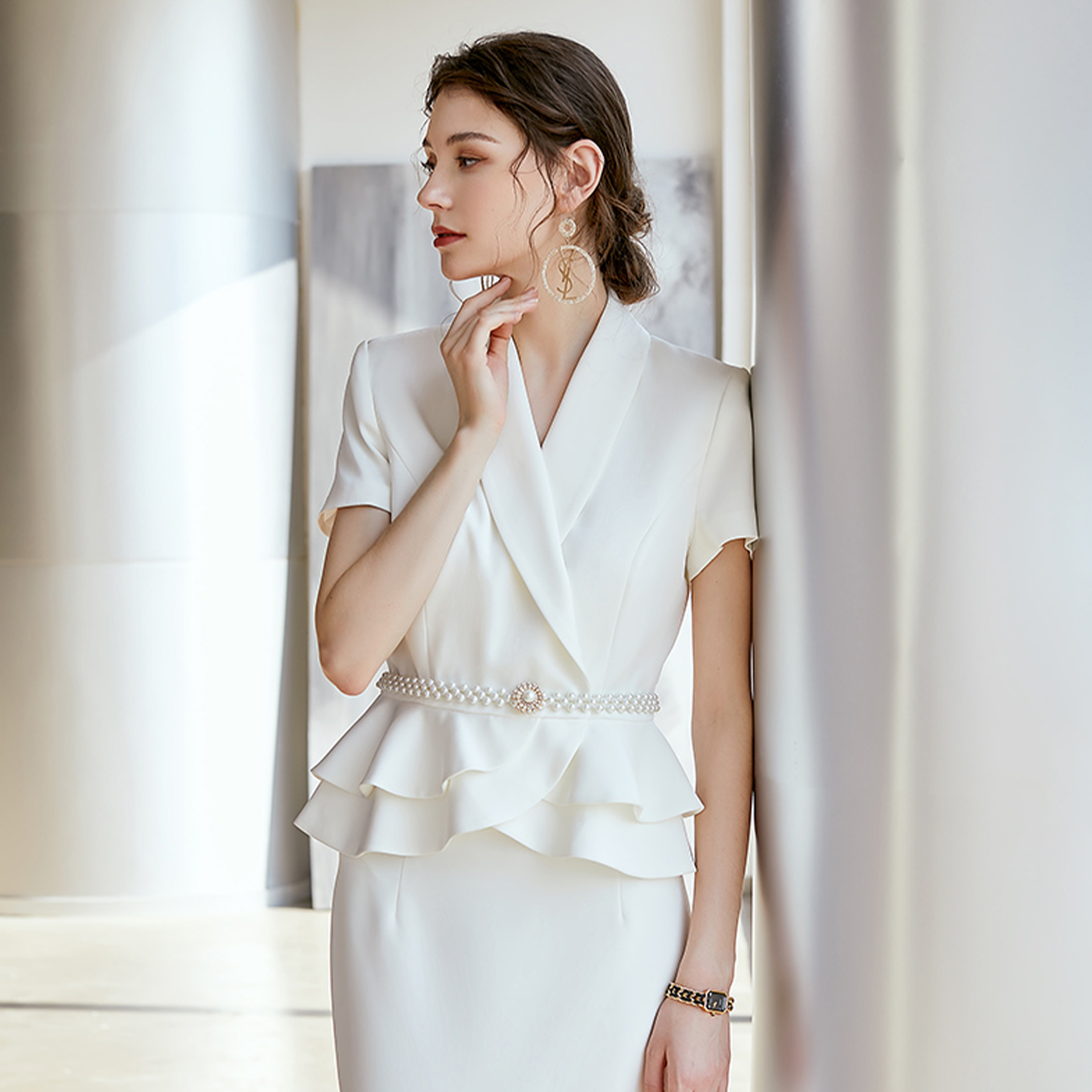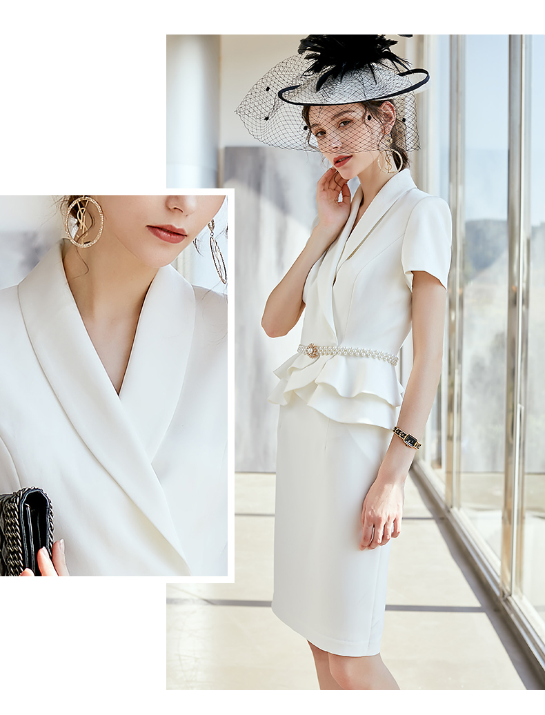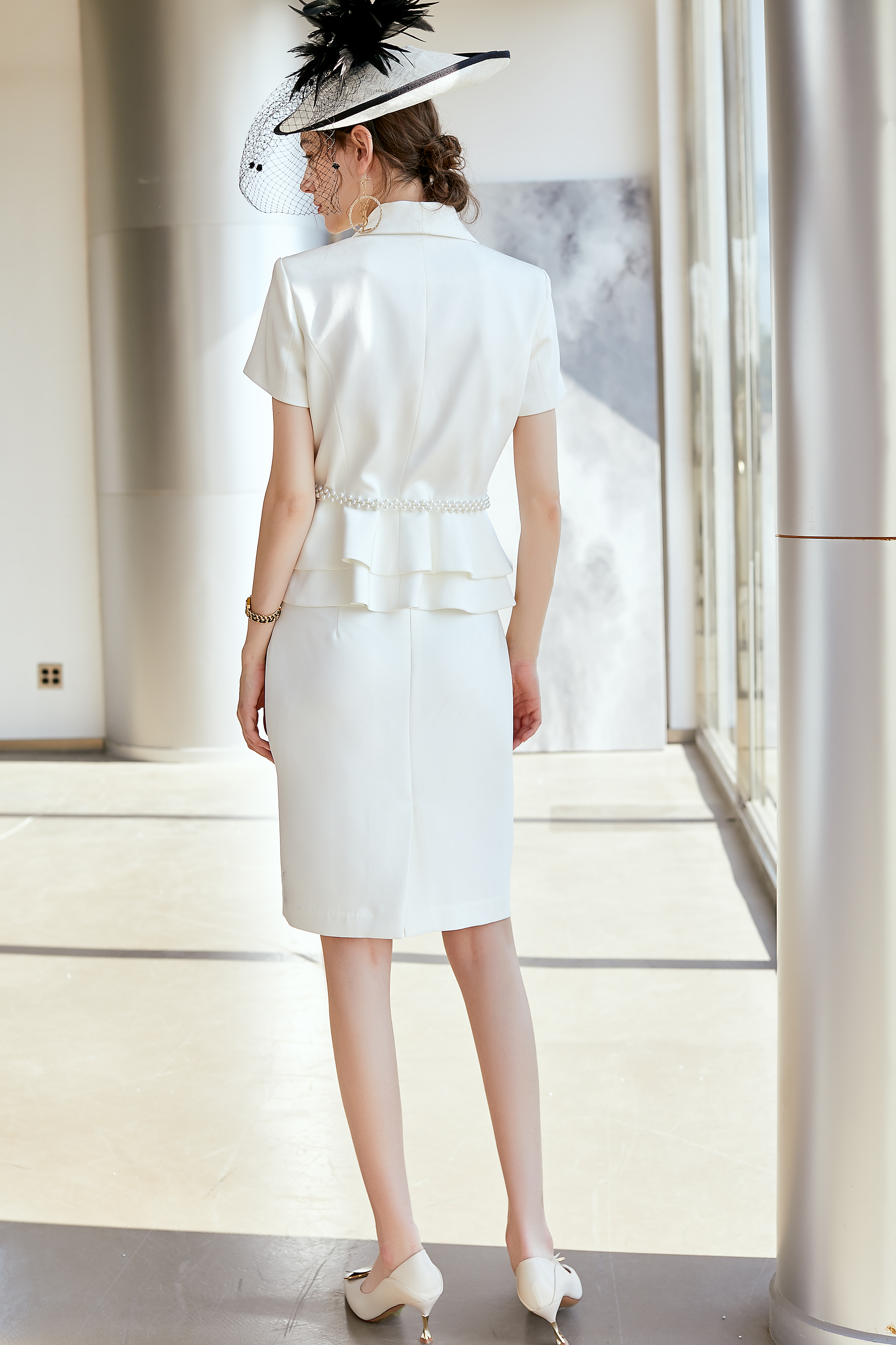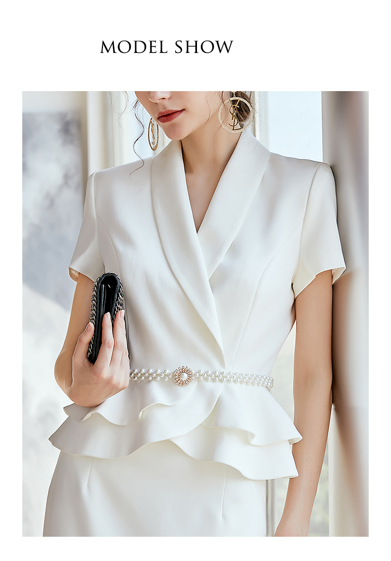 White Shawl Collar Ruffle Belt Short Sleeve Two Piece Suit